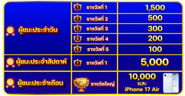 1.ผู้ชนะประจำวัน : User ที่ทำโบนัสแตกสูงสุด 1 ตา ภายในวันจะถือว่าเป็นผู้ชนะแบ่งเป็น 5 รางวัล ตามลำดับโบนัส